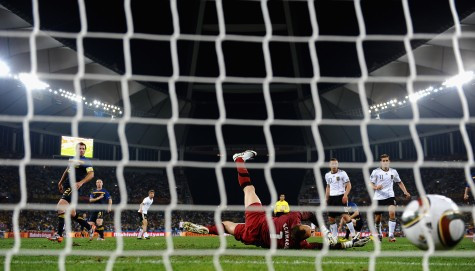 "Dieses Bild habe ich mit einer ferngesteuerten Kamera geschossen, die vor dem Start der Partie hinter dem Tor platziert wurde. Ich hatte aus diesem Winkel auf ein besonders gutes Foto gehofft, da das Durban Stadium eine beeindruckende Arena ist. Ich finde das Bild insbesondere deshalb gelungen, weil es so viel Action vor dem Tor zeigt und ein Sinnbild für den verkorksten Abend ist, den die Australier erleben mussten. Deren Torwart Mark Schwarzer kann nach dieser Szene nur noch den Ball aus dem Netz holen, das Tor schoss der deutsche Stürmer Thomas Müller."