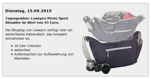 Wer die wetterfeste Tasche mit ihrem komplett entnehmbaren Kamerafach, einem Transportvolumen von 18 Litern und zusätzlichen Außentaschen für die Aufbewahrung von kleinerem Zubehör gewinnen möchte, muss nur unter www.fotohits.de fünf Online-Fragen beantworten. Viel Glück!